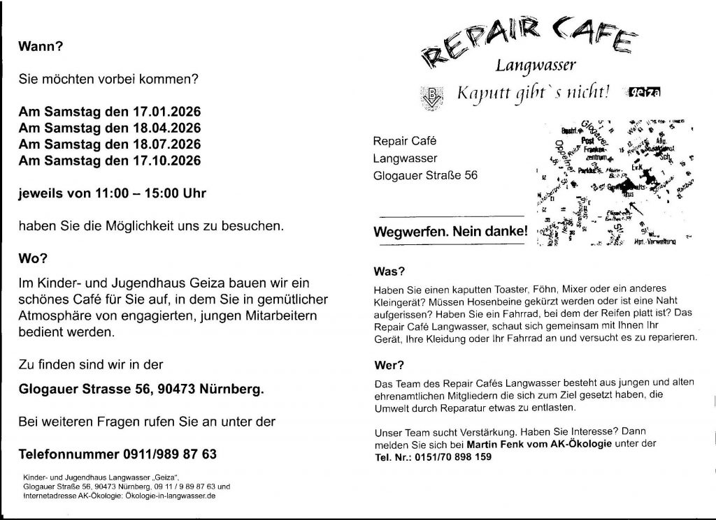 Nach einer einjährigen Planungszeit konnte das erste Repair-Cafè am 3. Februar 2018 im Kinder- und Jugendhaus Geiza starten. Der Zuspruch war groß und am 18. Januar 2020 gab es schon das zehnte Repair-Cafè. Darauffolgende Veranstaltungen konnten coronabedingt nur eingeschränkt durchgeführt werden mit Anmelde- und Wartebereich im Garten.